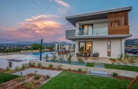 This contemporary, minimalist home is a superb choice for large groups. The home is spread between two villas, each with its own kitchen and living space – this is particularly convenient for multiple families travelling together. The villa sits on a hilltop and boasts wonderful views of the sea. As the sun is setting, there’s no better place to be than the outdoor dining area. Adelianos Kampos beach is a four-minute drive away, and you’ll also be close to Rethymno.