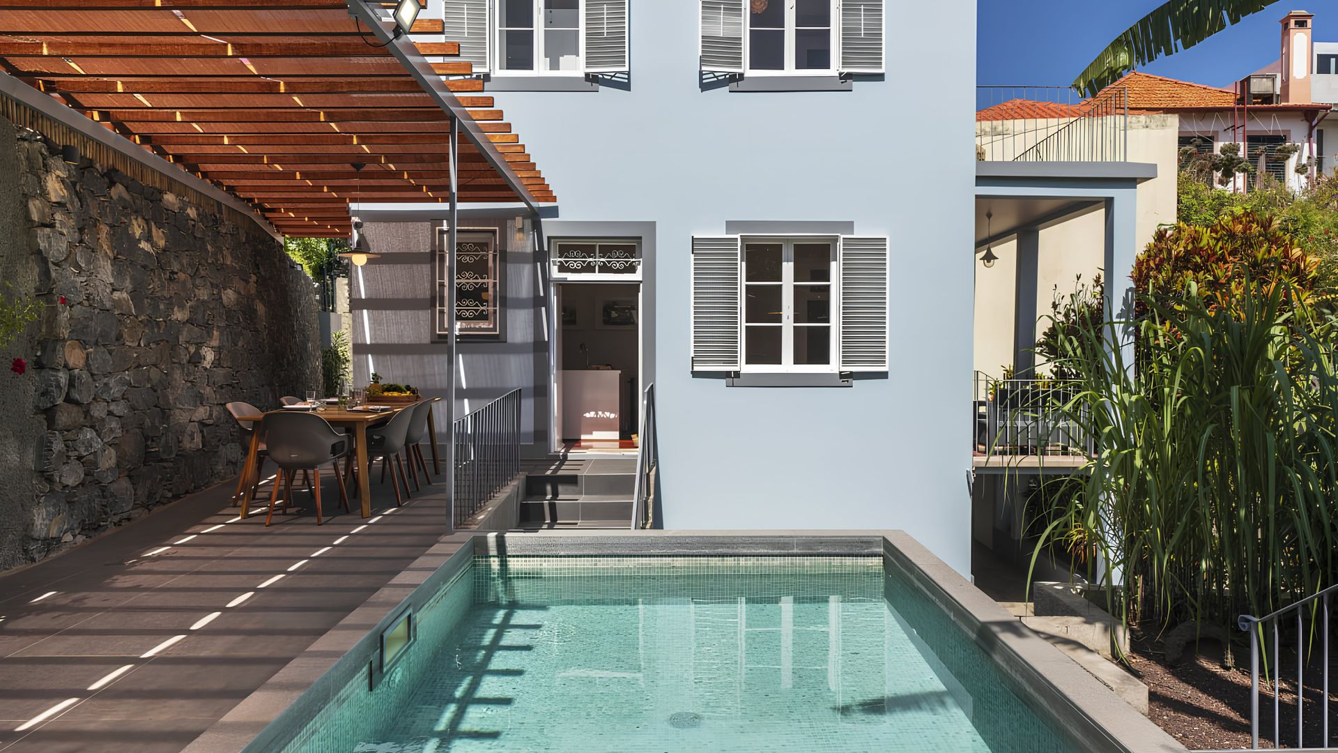 Escape reality and venture into our sanctuary, a traditional Madeiran villa seamlessly blending classic charm with modern convenience right in the heart of Funchal. Perfect for up to 6 guests seeking an unique haven, this property boosts two beautifully designed suites with plush double beds and a shared balcony on the first floor. Downstairs, a welcoming living room featuring comfortable seating and a functional bathroom accord you all the comfort of home. The kitchen and dining area amalgamate for delightful social meal prep experiences. Step outside and discover a serene swimming pool, al fresco dining area, sun-deck and inviting garden. Indulge responsibly in the lush fruits or aromatic herbs, keeping mindful of the towering banana trees. Let children revel within the hidden garden while adults bask in harmonious tranquillity. Experience a slice of island bliss, perfect for lingering memories.